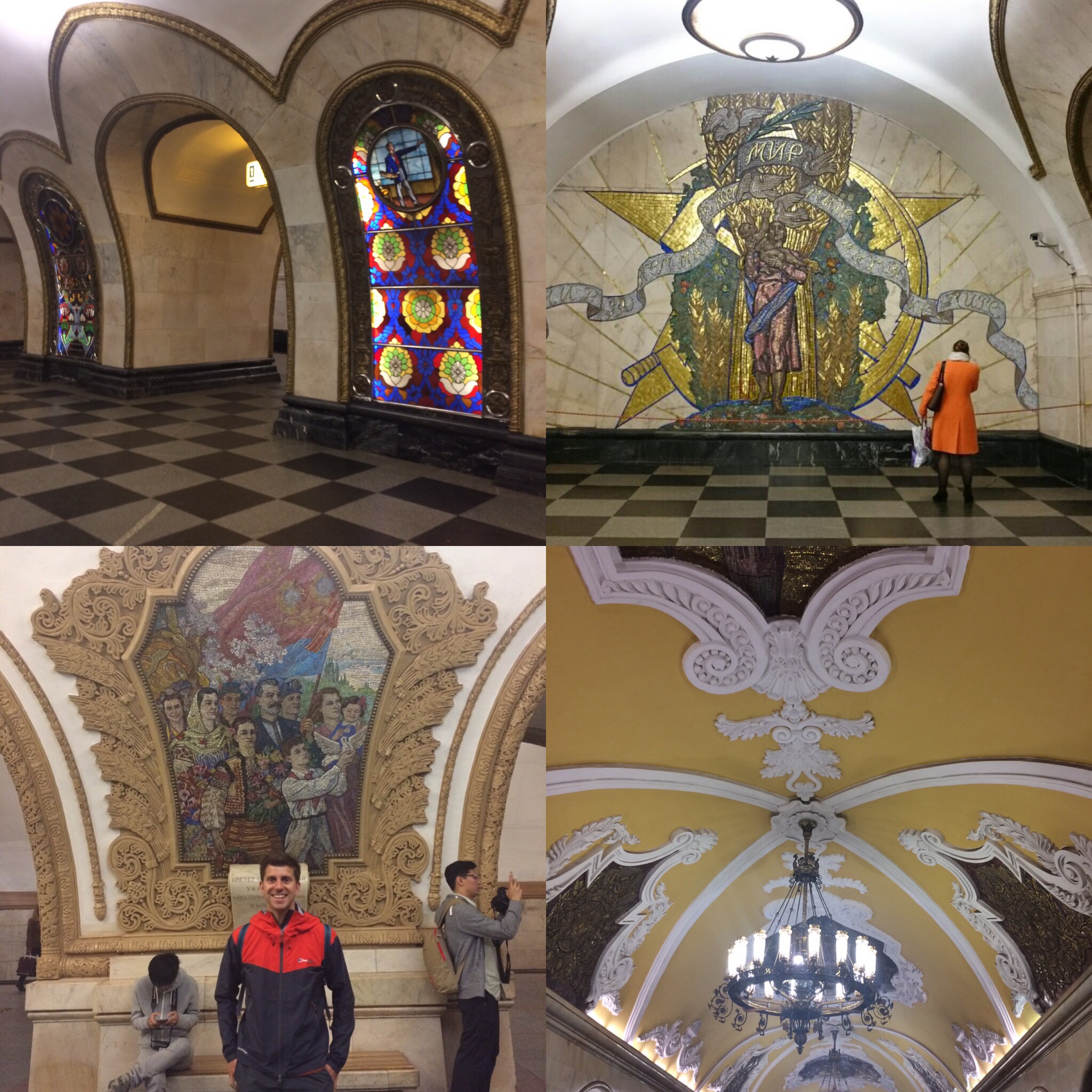 Moscow metro system was the first in the Soviet Union and one of the longest in the world! Our guide told us a story about the brown circle line that surrounds the city centre; when the plans for the metro were being drawn up, Joseph Stalin placed his coffee cup on the paper. When he lifted it up, it left a brown ring and the men in charge of the plans were to i frightened of him to ask if he meant to do that. So they built it! Cute story, but not true 🙂 That circle line has the most notable stations, with distinct ‘Stalinist’ features.