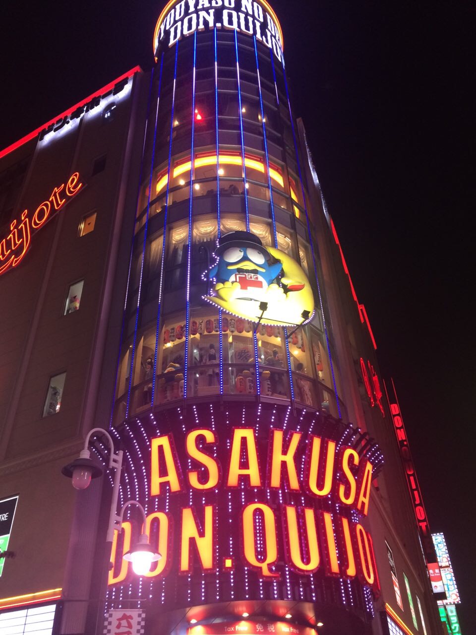 Having not eaten in a while, we headed out into the local area to find lunch. The streets were full of small shops and cafes, and several streets were lined with market stalls. We ate at a noodle bar, where, having placed our order at a vending machine outside, we handed printed tickets to the chef, who promptly served us delicious meat and noodles. During check-in at the hostel we were told where the nearest ATM, 7 Eleven and bars, etc, where. We were also told of a nearby convenience store where you can get “anything you want”. This seemed an odd thing for the hostel to tell us about, until we saw Asakusa Don Quijote for ourselves. We counted six floors filled with food, cosmetics, clothing, electrical goods, fancy dress outfits, a restaurant and lots of chocolate. We visited several times!