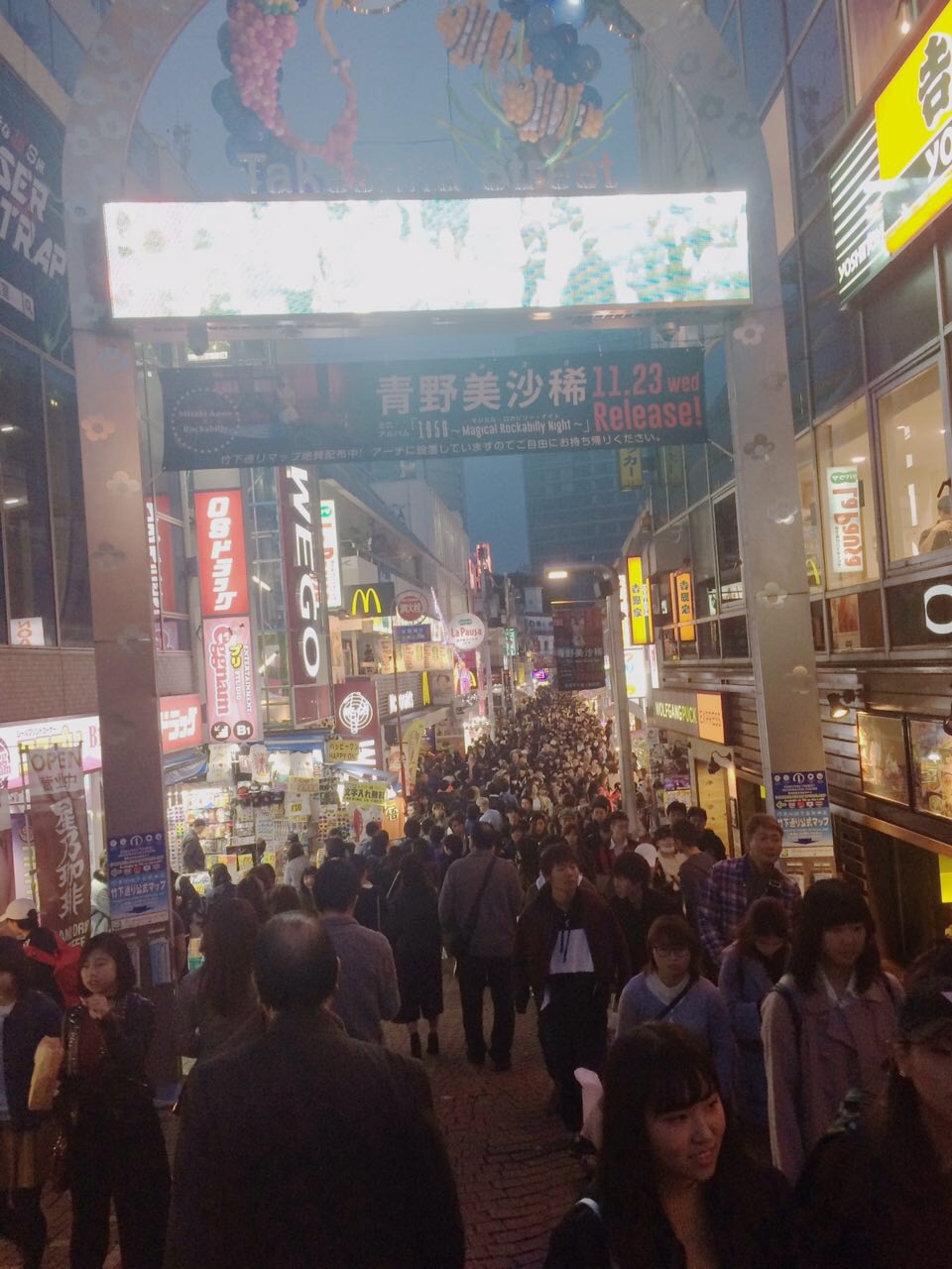 On Sunday we took the Metro to Harajuku, as we wanted to see the young people of Tokyo in their natural habitat: clothes shops! Firstly, though, we headed to Meiji Shrine, where we were fortunate enough to witness part of a wedding ceremony. Due to seeing many shrines and temples in the preceding days, we didn’t hang around long. We started our window shopping on Omotesando, a tree lined boulevard filled with high-end fashion stores. Feeling under dressed and a little financially inferior, it didn’t take us long to move onto Takeshita Dori, where hundreds of Tokyo’s teenagers slowly made their way from clothes shop to cafe to candy floss stall. Although quite a site to behold, I had expected to see more outrageous outfits. Instead, most people wore the jeans, trainers and t-shirt uniform of young people back home.