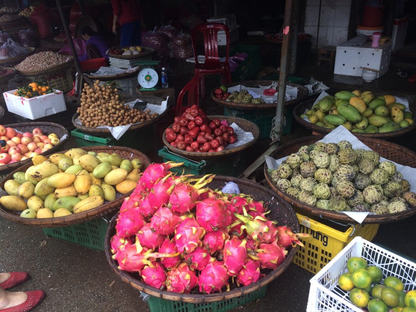 After a very bumpy journey, which included an excellent beef noodle breakfast and less sleep than I had hoped for, our pre-booked driver met us at Hué train station and drove us to our hotel, where jasmine tea and fresh fruit awaited. After checking in and showering, we set off for a walk in the rain. We walked to the Perfume River, and crossed the bridge to Dong Ba Market. Outside, the market consisted mainly of food stalls, which I assume, based on the enormous quantities, supply local restaurants with meat and vegetables. Inside, there was a mix of spices, coffee, clothing and footwear. After a wander around the parks by the river and a look at the outside of the Imperial Citadel, we ate near the hotel, then headed back to Skype our families.