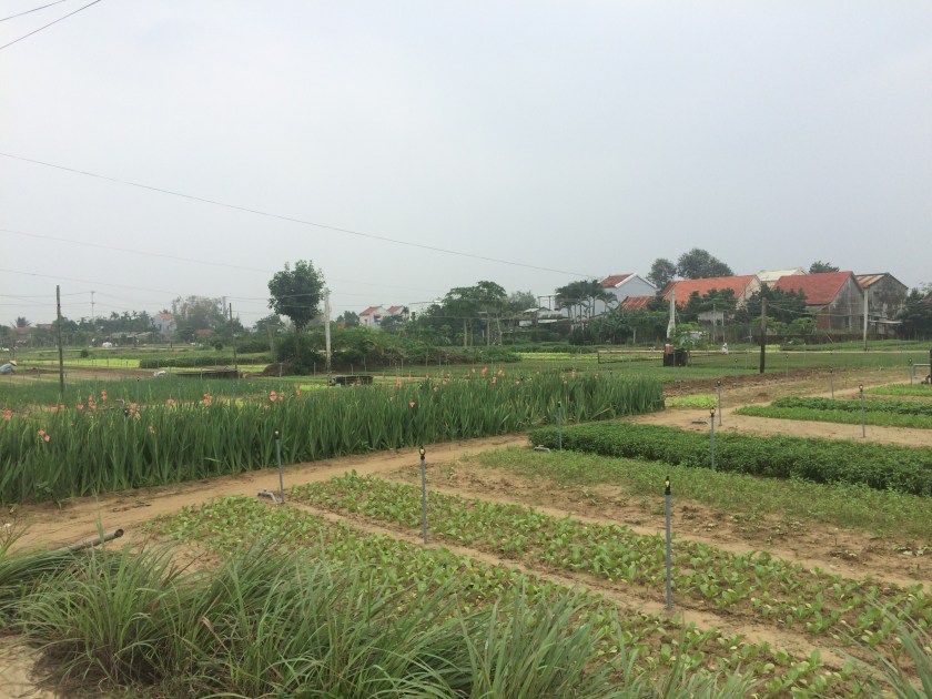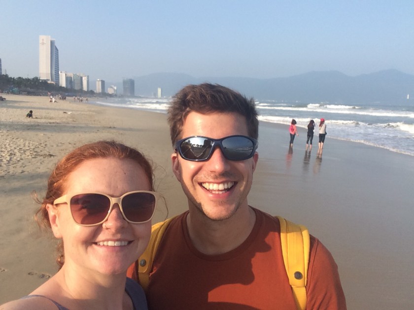 On Saturday morning, we went on a cycling trip run by a company called Path Bikers. We cycled around villages in the area, visiting a herb farm that was 400 years old, observing boat builders who were building a tourist boat, and stopping to take photos of water buffalo, cows, water palms and coconut trees. After a really enjoyable ride, we asked the guide’s recommendation for lunch in Danang. He didn’t just offer a suggestion, but took us to a restaurant and ordered for us. We had pork skewers (nem lui) and rice pancakes (banh xeo), served with peanut (and pig liver – thanks for the info, Fionnuala!) sauce. The food was amazing, and we would never have found the restaurant by ourselves.